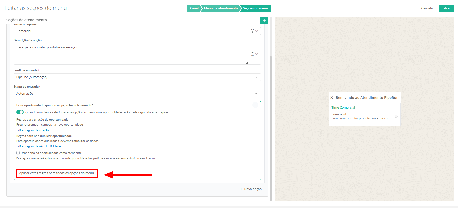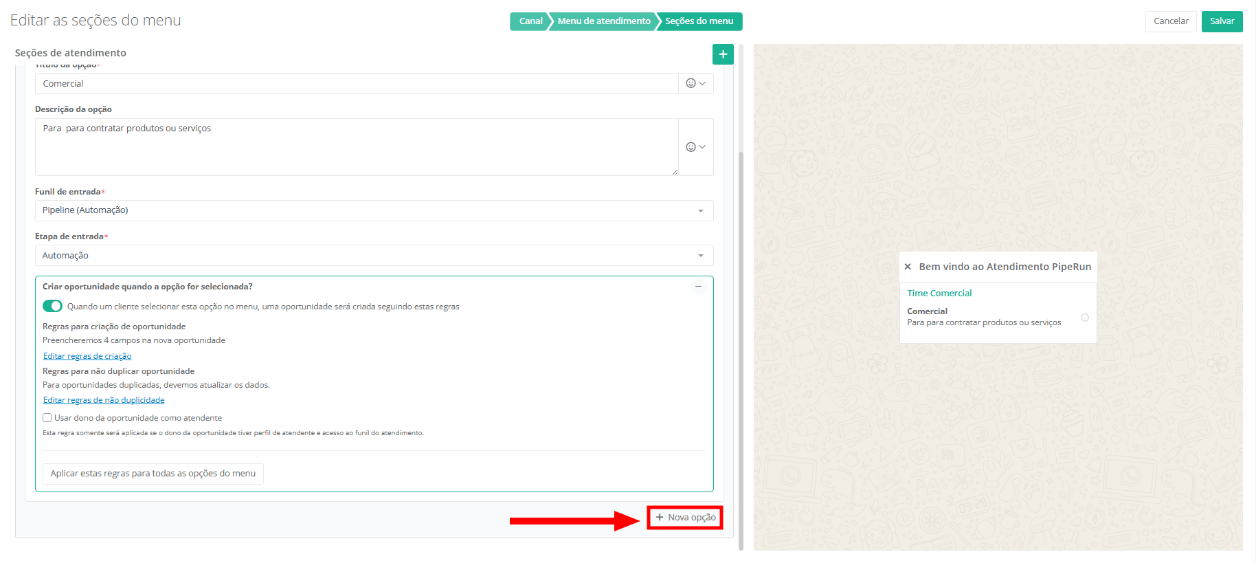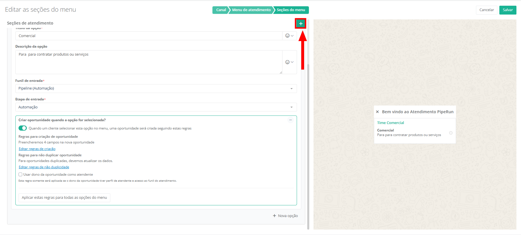 - Criar oportunidade quando a opção for selecionada: clique no botão de "+", caso deseje criar automaticamente uma oportunidade quando o cliente selecionar a opção de atendimento.