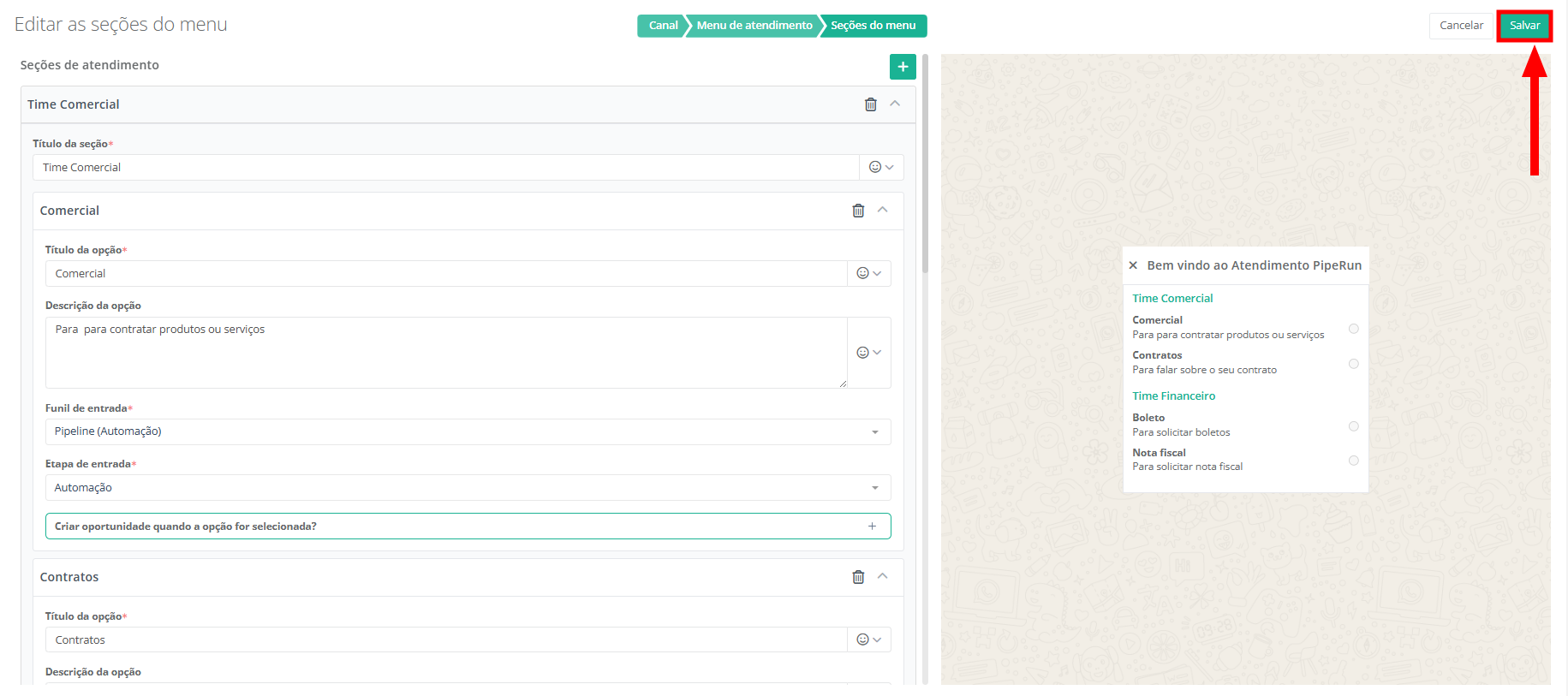 13. Finalizada as configurações das seções de atendimento, clique em "Salvar".