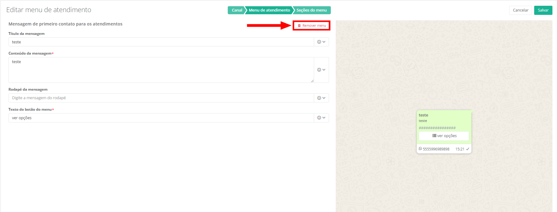 2. Não quero utilizar um menu para primeiro atendimento do cliente, é possível remover o menu das configurações e permitir que o atendimento seja imediatamente transferido para um atendente?