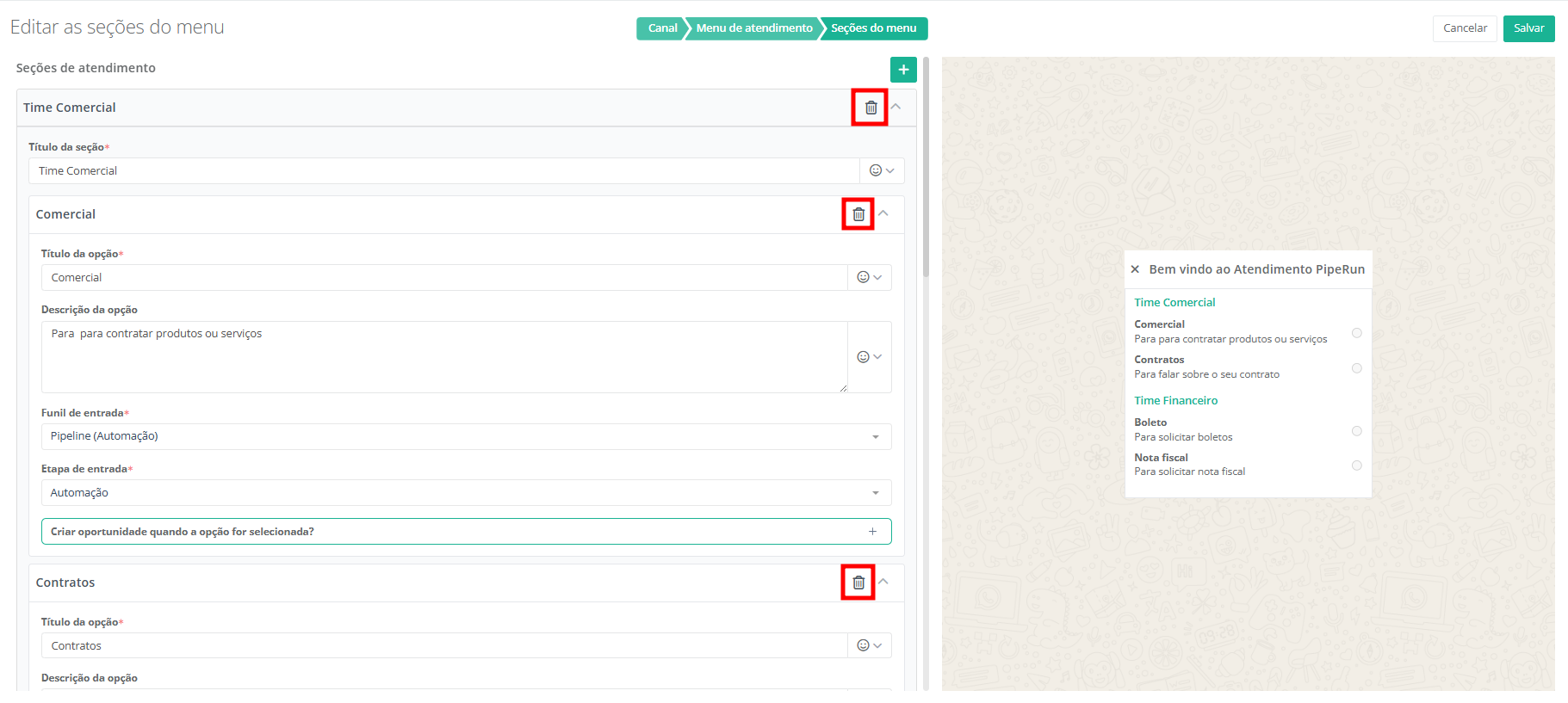 Dica: o menu de atendimento é dividido em seções e dentro de cada seção é criada as opções de atendimento. É possível criar uma ou mais seções conforme desejar organizar o menu de atendimento.