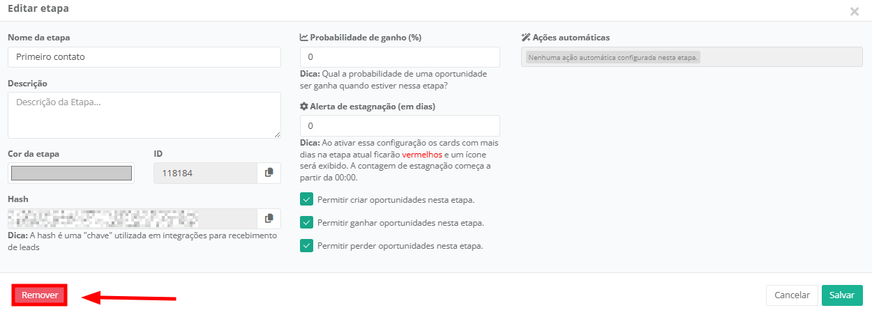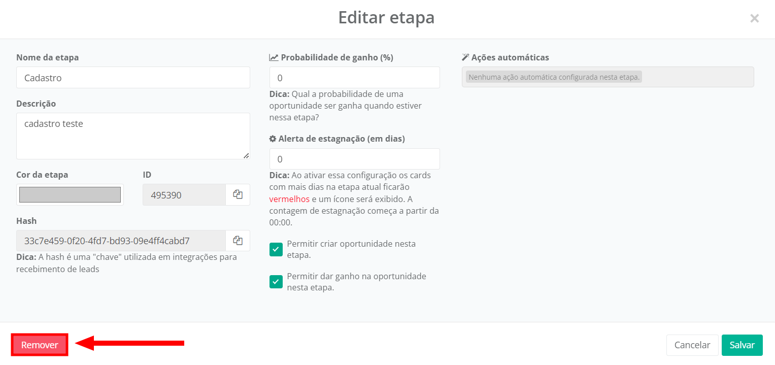 Dica: para remover uma etapa, basta clicar em "Remover" na tela de edição da mesma.
