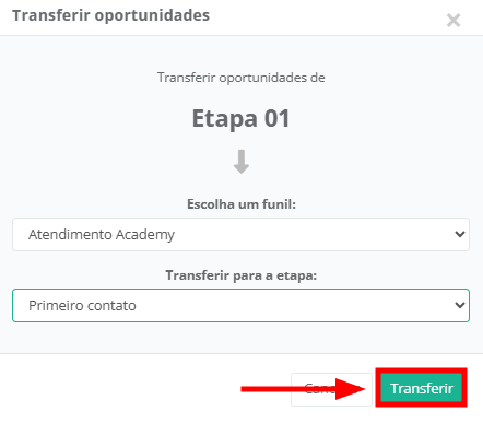 6. Informe para qual funil e etapa as oportunidades cadastradas na etapa devem ser transferidas, e clique em "Transferir".