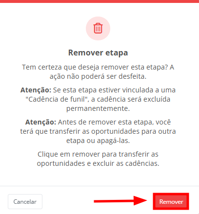 Cadência de Funil: Se a etapa possuir uma "Cadência de funil" vinculada, essa cadência será excluída permanentemente. Certifique-se de que não há fluxos de automação essenciais ativos nesta etapa antes de prosseguir.