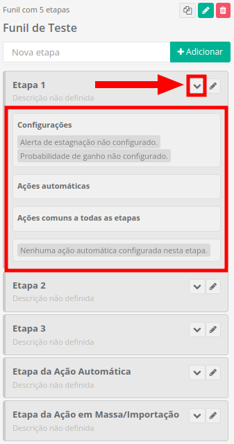 7. Ao clicar no ícone da seta, o usuário pode visualizar todas as ações configuradas para a etapa, como por exemplo, alerta de estagnação, probabilidade de ganho e ações automáticas cadastradas.