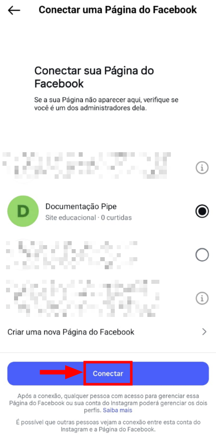 12. Selecione a página que deseja conectar a sua conta e toque em "Conectar".