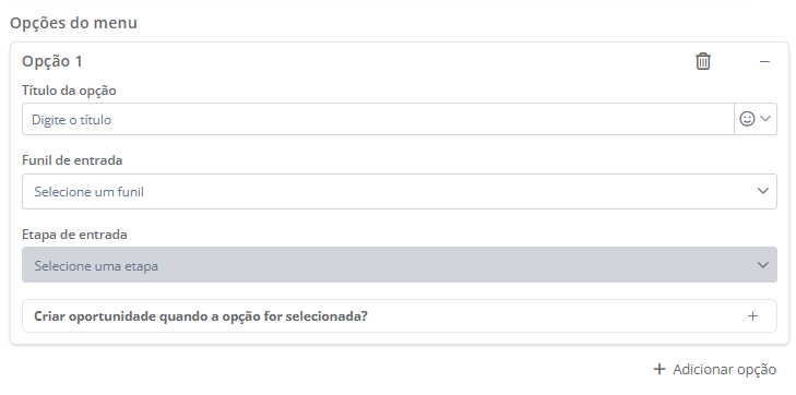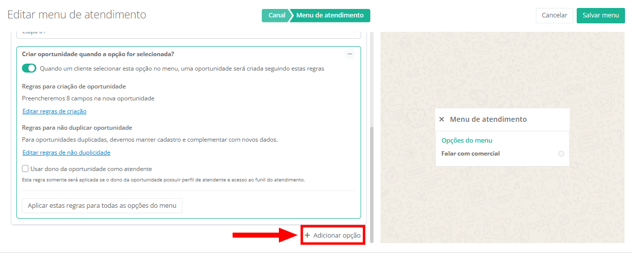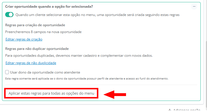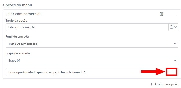 - Criar oportunidade quando a opção for selecionada: clique no botão de "+", caso deseje criar automaticamente uma oportunidade quando o cliente selecionar a opção de atendimento.