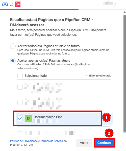 10. Escolha a página que você conectou (1) ao seu perfil do Instagram e clique em "Continuar" (2).