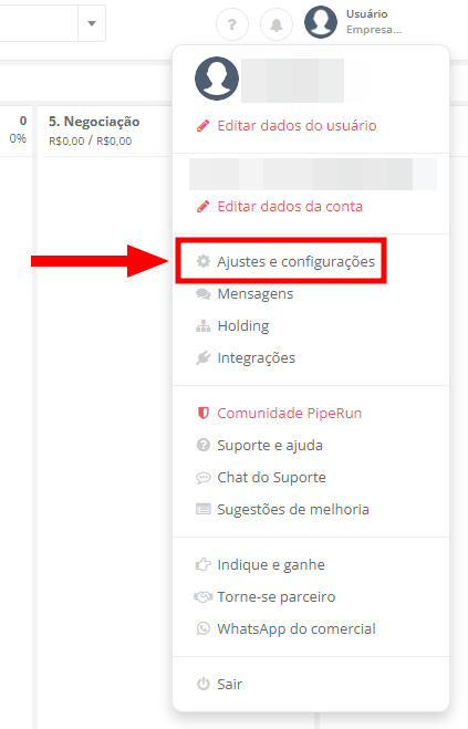 1. Posicione o mouse sobre o avatar da conta, localizado no canto superior direito da tela. Clique em "Ajustes e configurações".