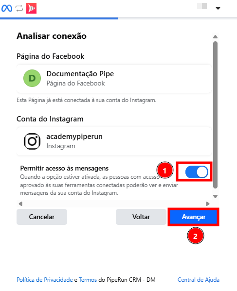 9. Deixe a opção "Permitir acesso às mensagens" (1) habilitada e clique em "Avançar".