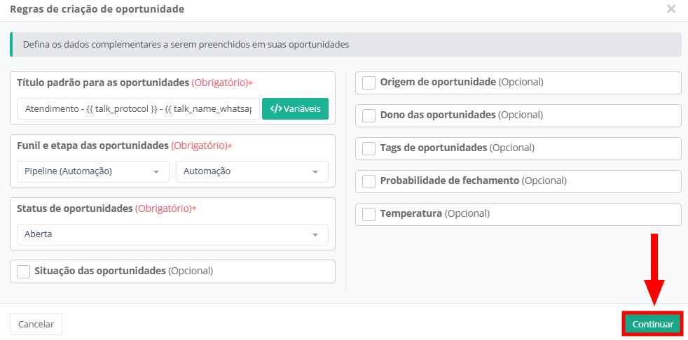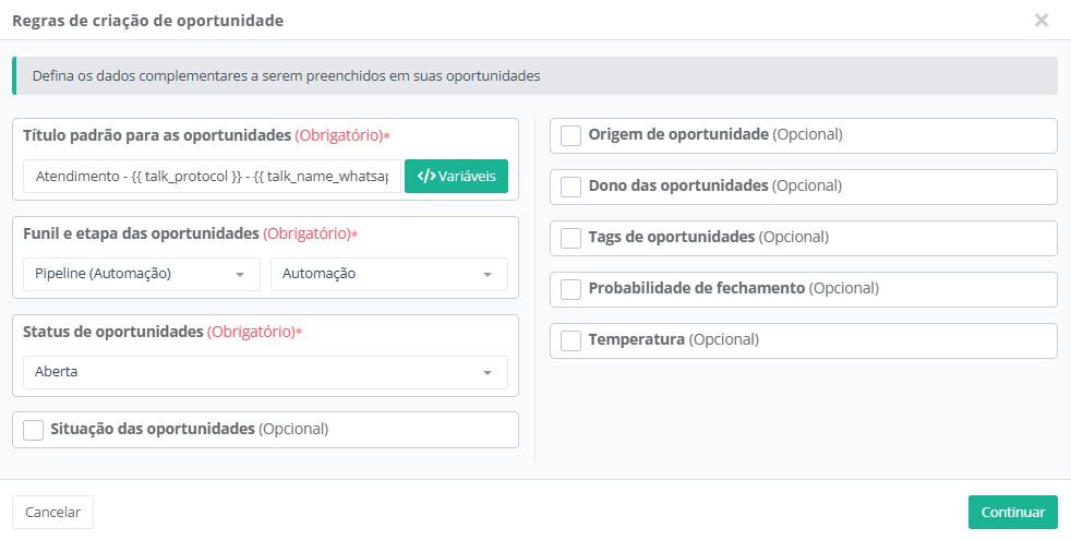 Dica: é possível utilizar variáveis no título das oportunidades. As variáveis disponíveis estão relacionadas ao atendimento, como nome no WhatsApp, protocolo do atendimento, nome da seção do menu, etc.