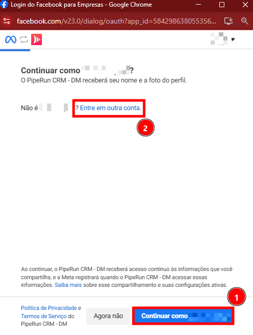 6. Caso seu perfil já esteja conectado ao seu navegador clique em "Continuar como", ou Clique em "Entrar com outra conta" para fazer o login com outra conta.