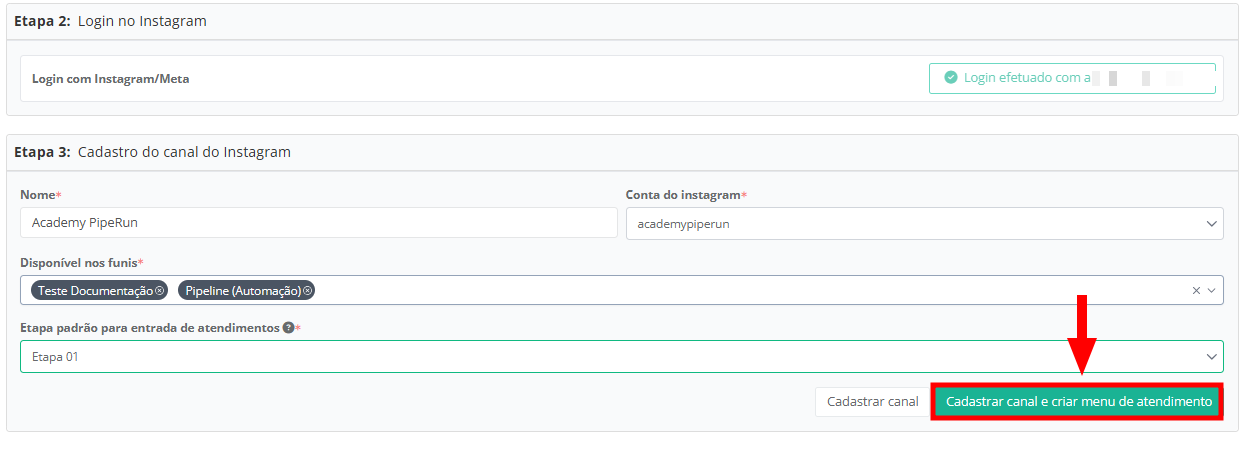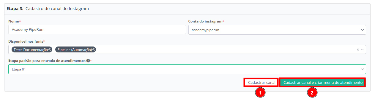 - Etapa padrão para entrada de atendimentos (obrigatório): Defina em qual etapa do funil os atendimentos do Instagram serão criados automaticamente quando não vierem através de um menu de atendimento.