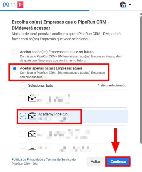 Atenção! É obrigatório selecionar a mesma empresa utilizada na criação da sua conta do Instagram. Caso contrário, não será possível prosseguir para as próximas etapas de configuração do canal.