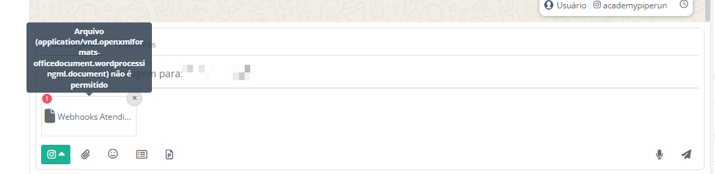Ao tentar fazer o envio de um arquivo em formato não permitido será exibida uma mensagem informando o problema.