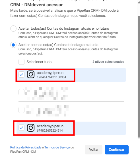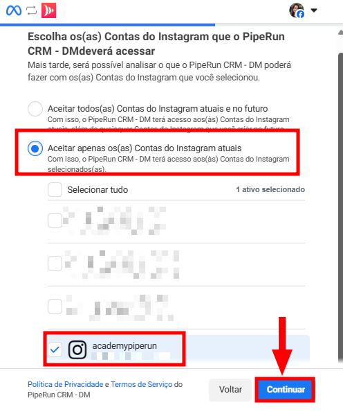 12. Selecione a conta do Instagram que deseja conectar ao módulo de atendimento.