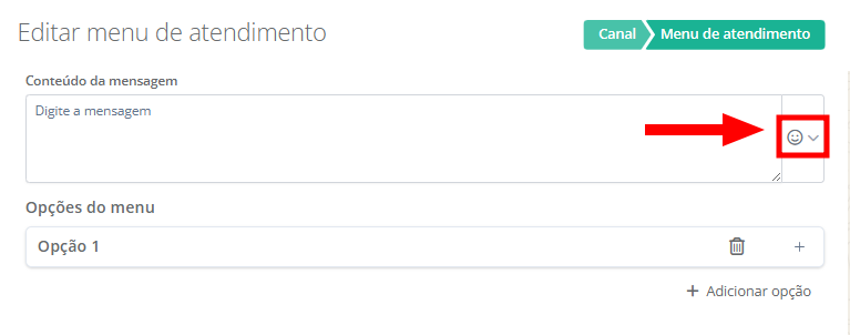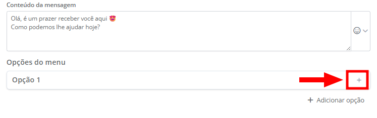 3. Na seção "Opções do menu" serão configuradas as opções de atendimento. Clique no botão "+" para realizar as configurações