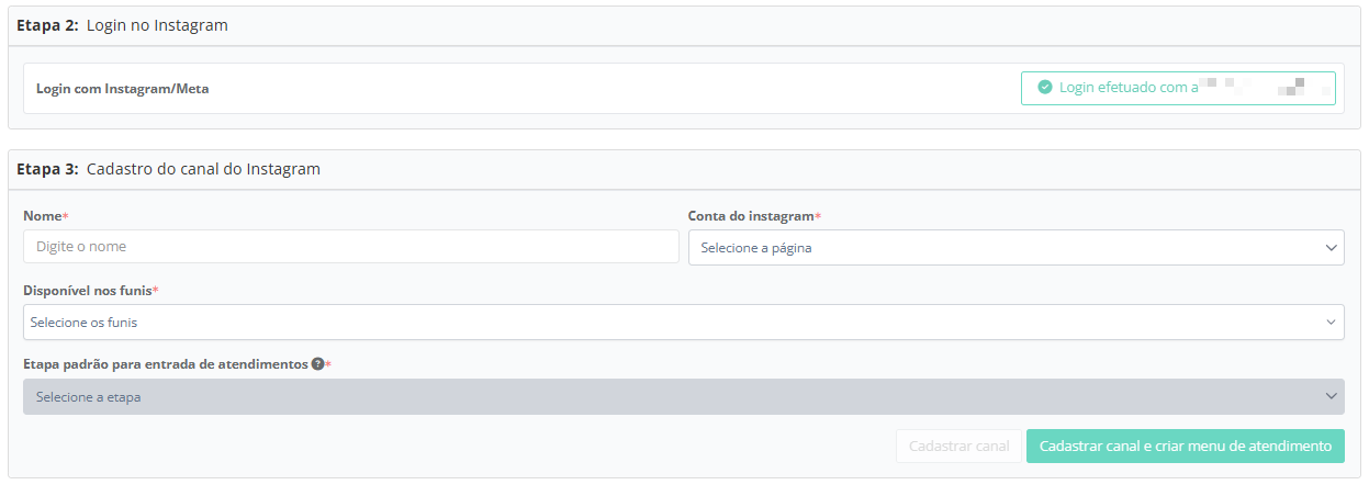 Atenção! Só será listado funis e etapas que foram configurados no tópico 15 do cadastro de conta de canal.