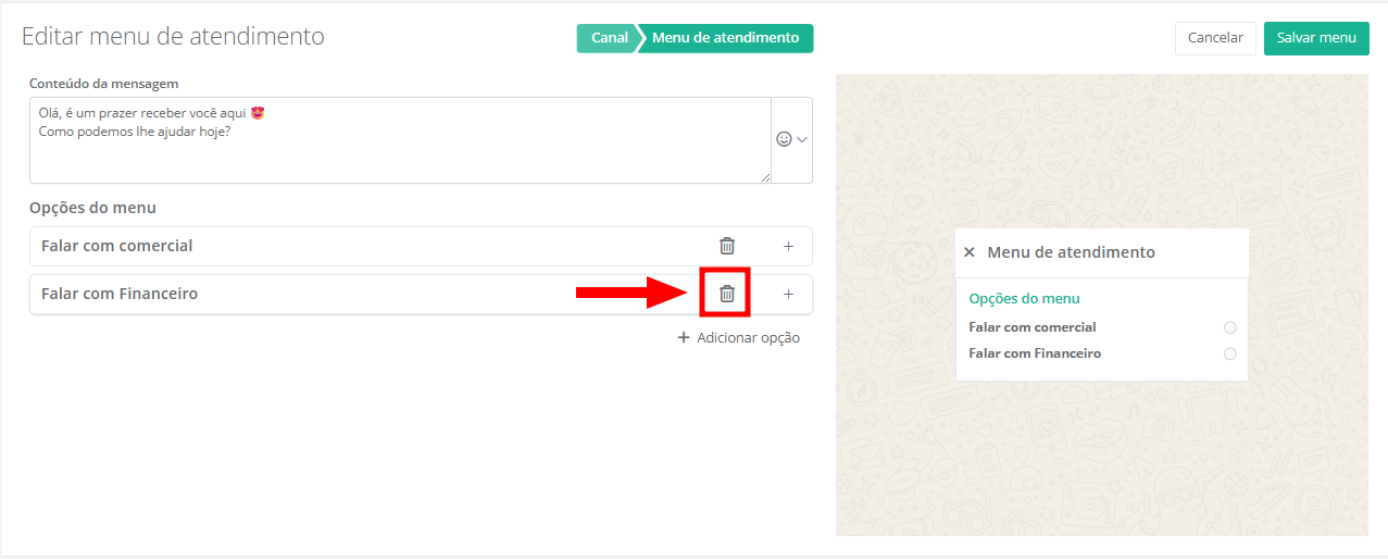 Atenção! O menu de atendimento é a primeira mensagem que o cliente irá receber quando entrar em contato com a empresa. Ele permite que o cliente selecione com qual setor ou sobre qual assunto deseja falar. Essa configuração é opcional.