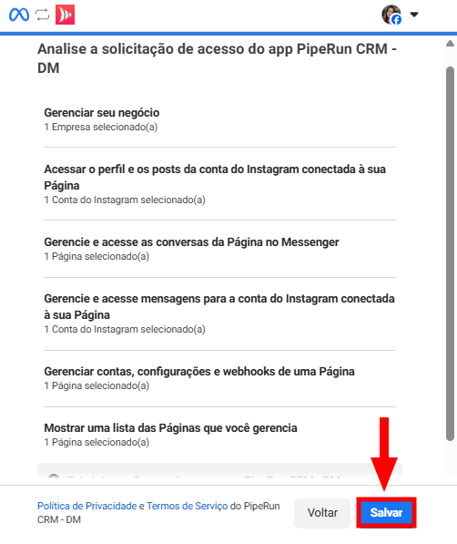 Repita os passos de configuração, certificando-se de selecionar todas as empresas listadas na sua conta, conforme orientado no passo 11 do tópico “Como conectar o Instagram ao módulo de atendimento”.
