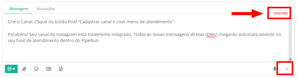 Ao tentar fazer o envio de uma mensagem muito grande será exibido o contador de caracteres e o botão de envio será desabilitado até que a mensagem seja reduzida.