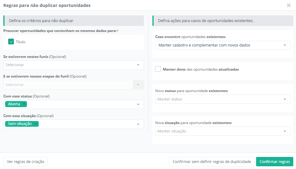 7. O próximo passo, será configurar as regras para não duplicar oportunidades.