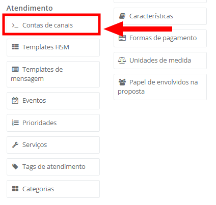 2. A seguir, clique em "Contas de canais", na coluna "Atendimento".