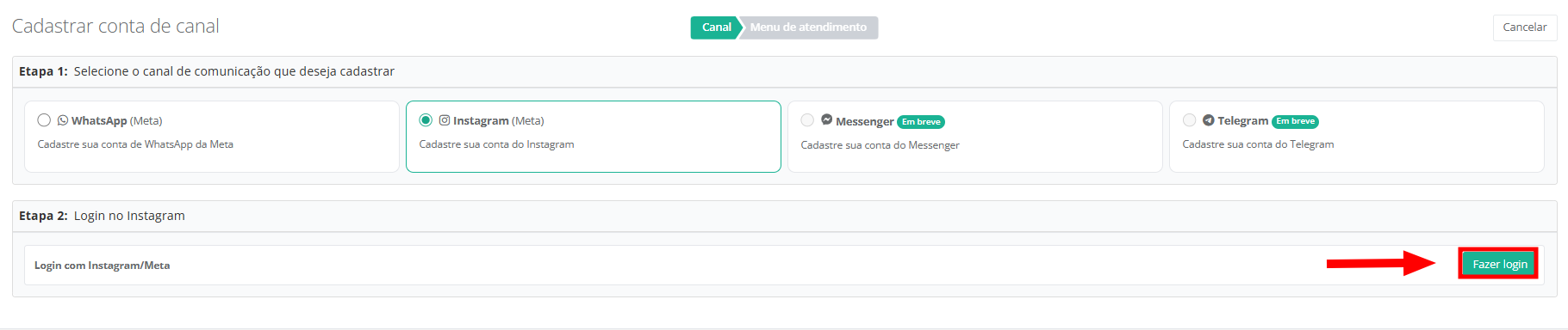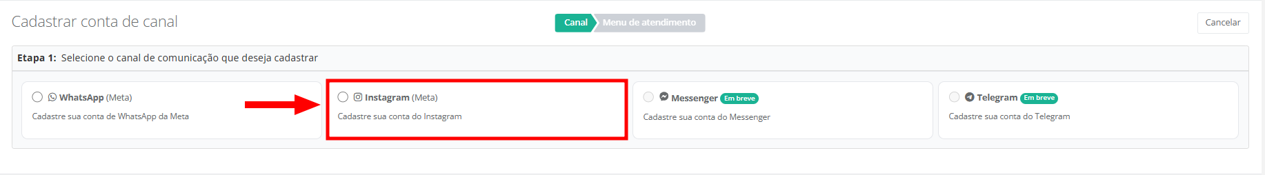 4. As configurações do canal serão realizadas em quatro etapas: Na etapa 1, selecione o Canal de Instagram para iniciar o processo de conexão.