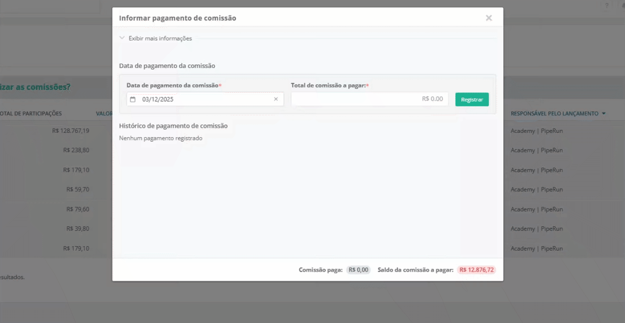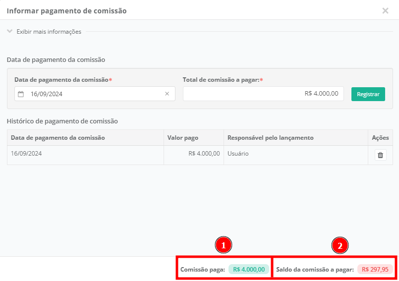 - Saldo da comissão a pagar: exibe o valor total a ser pago de comissão. Caso sejam feitos pagamentos parciais, este valor exibirá o restante.