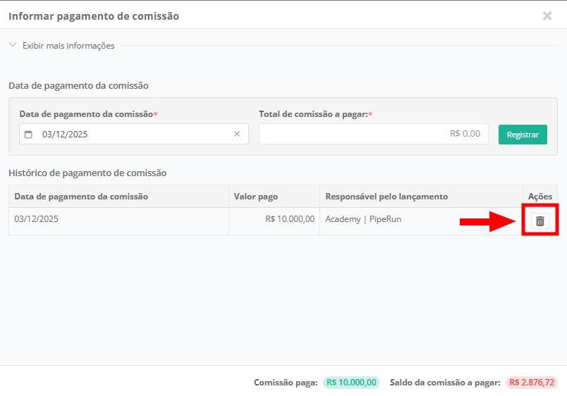 8. Para excluir um pagamento na seção "Histórico de pagamento de comissão", clique na lixeira na coluna de ações.