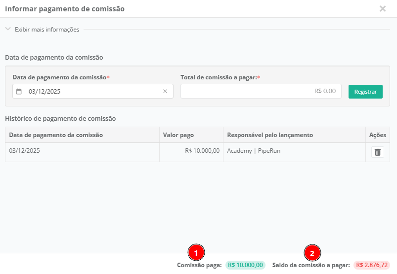Dica: os pagamentos de comissões podem ser feitos de forma parcial. Na parte inferior da tela de pagamento de comissões, serão exibidos os valores de comissão paga (1) e saldo de comissão a pagar (2).