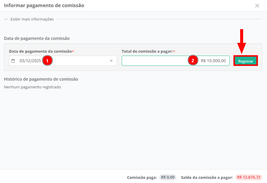 5. Informe a data de pagamento da comissão (1) e o total de comissão a pagar (2). Por fim, clique em "Registrar".