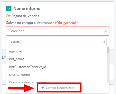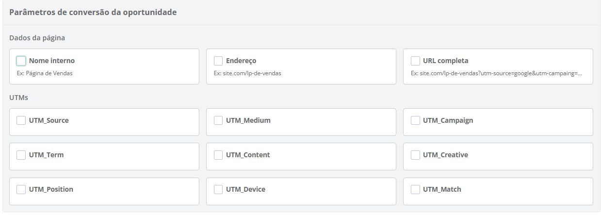 Além dos dados da página, é possível registrar na oportunidade os parâmetros de UTMs, possibilitando análises mais aprofundadas da origem do tráfego da sua landing page. Para isso, escolha qual informação de UTM deseja registrar e o campo customizado onde será disponibilizada, estando disponível: