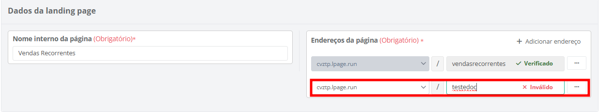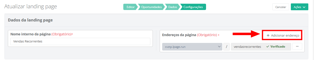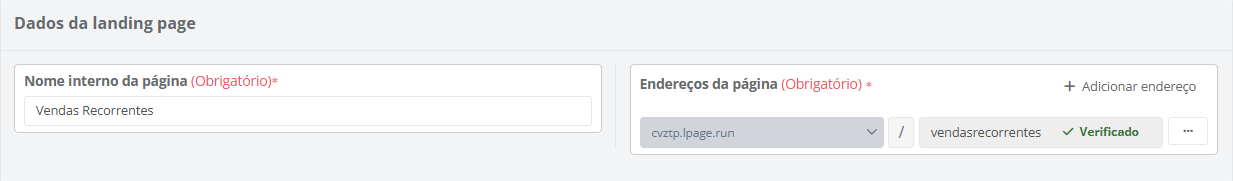 - Endereço da página: este campo já será preenchido automaticamente com o domínio informado na primeira etapa da criação da landing page. Caso necessário, você pode remover o domínio sugerido e/ou adicionar outros domínios nesta etapa.
