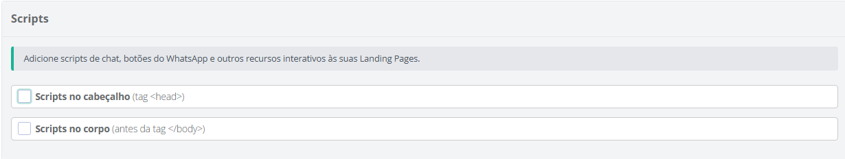Adicione scripts de chat, botões do WhatsApp e outros recursos interativos às suas landing pages.