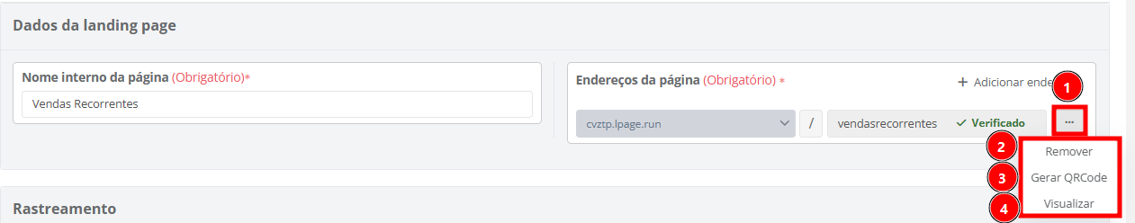 Ao clicar em Ações (1) é possível remover (2), gerar QR code (3) ou visualizar (4) a página que está sendo criada.