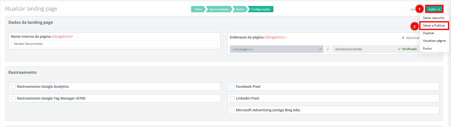 Para finalizar a criação da landing page, passe com o cursor do mouse sobre o botão de "Ações" (1) e, após, clique em "Salvar e publicar" (2).