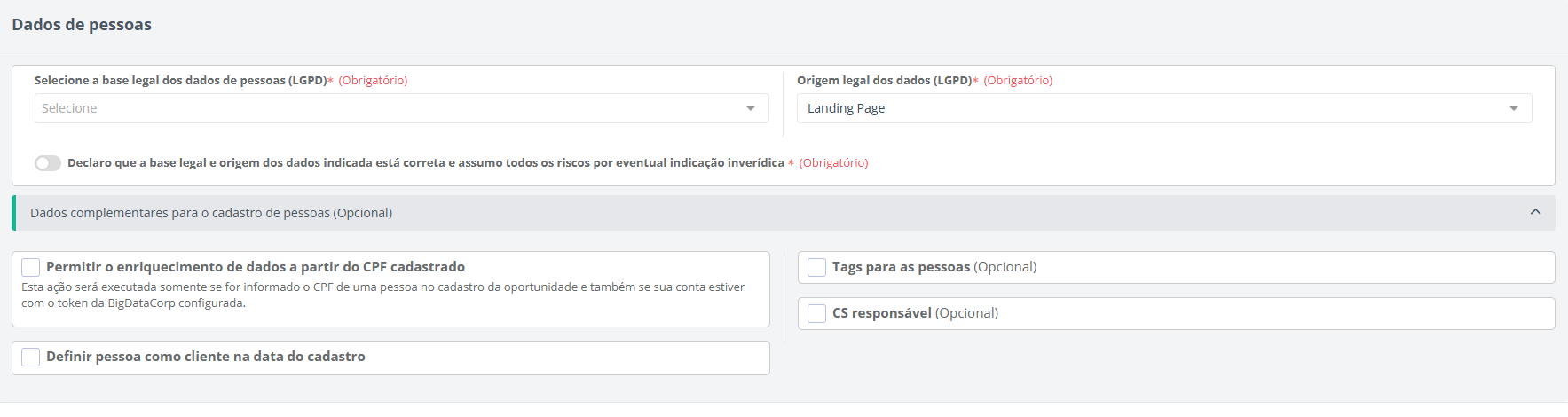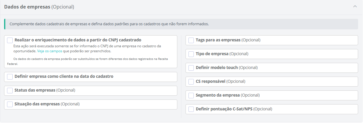 Nesta etapa, são realizadas configurações padrões sobre os dados das oportunidades criadas a partir da landing page, além dos dados de empresas e pessoas.
