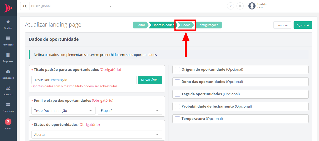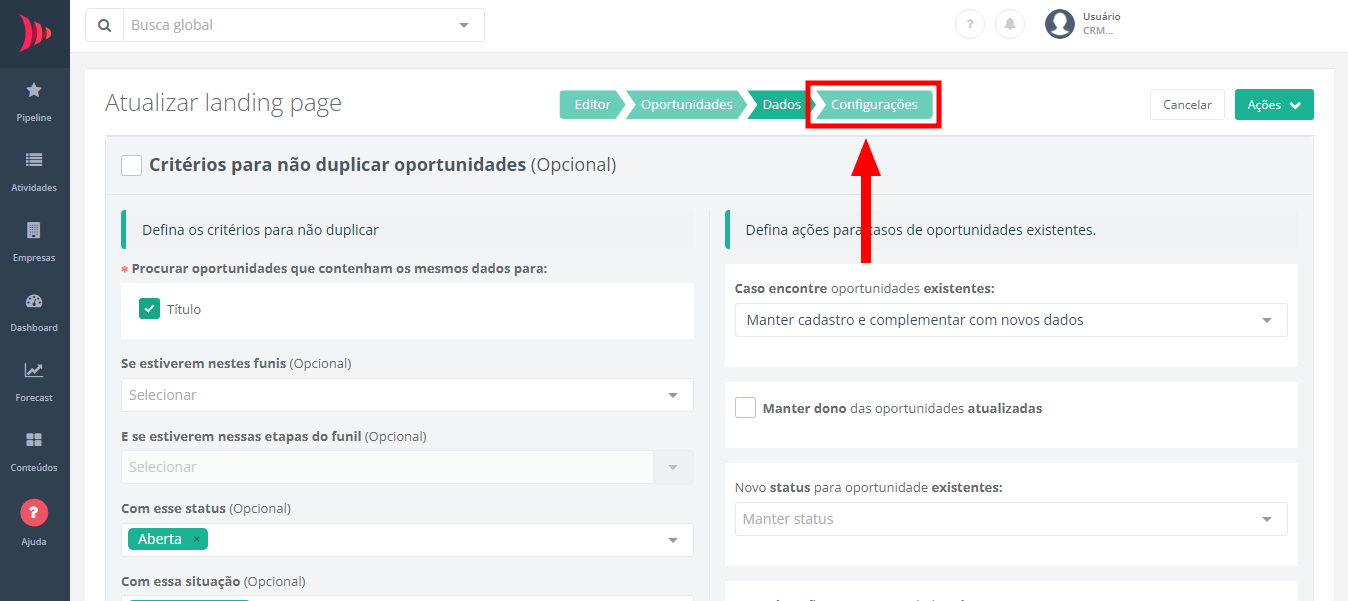 Para configurar as regras de cadastro das oportunidades geradas a partir da landing page, clique em "Oportunidades".