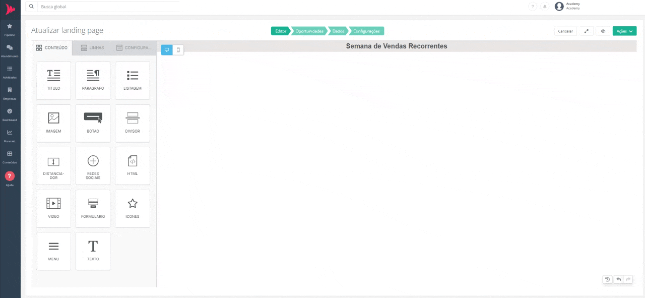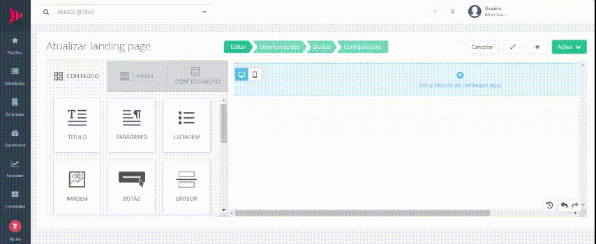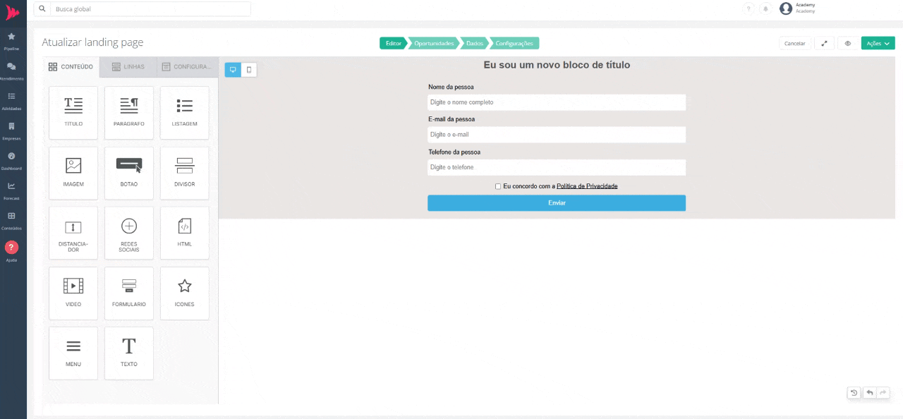Pronto! Essas foram as principais ferramentas de personalização da sua página da landing page. Na próxima etapa serão configuradas as regras de criação de oportunidades a partir do preenchimento do formulário da landing page.