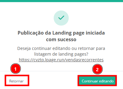 Será exibida uma mensagem em tela informando que a publicação da sua landing page foi iniciada. É possível retornar (1) ou continuar editando (2).