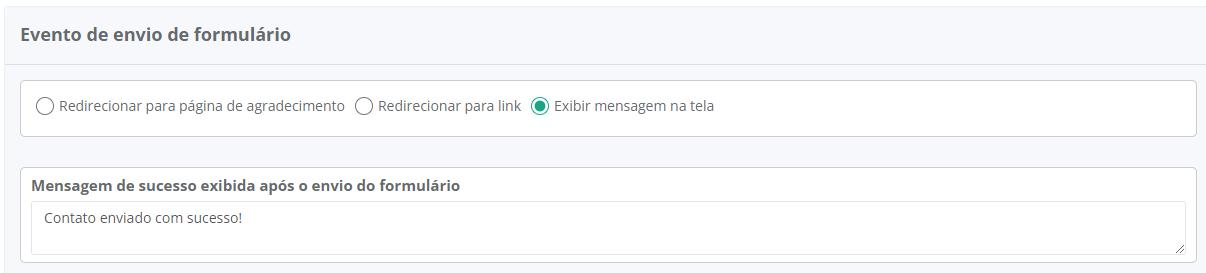 - Exibir mensagem na tela: configure a mensagem que será exibida em tela toda vez que o formulário da sua landing page for respondido.