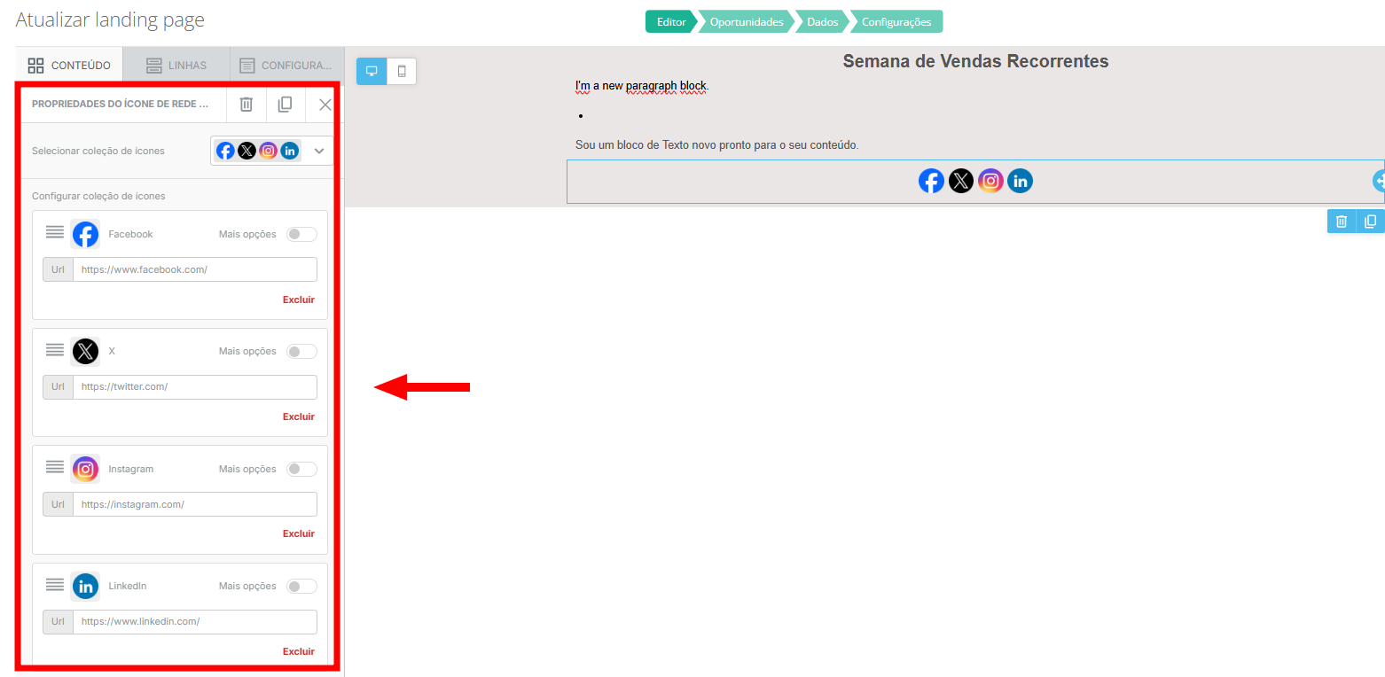 - Redes sociais: insere ícones de redes sociais, com possibilidade de configuração da URL de redirecionamento;