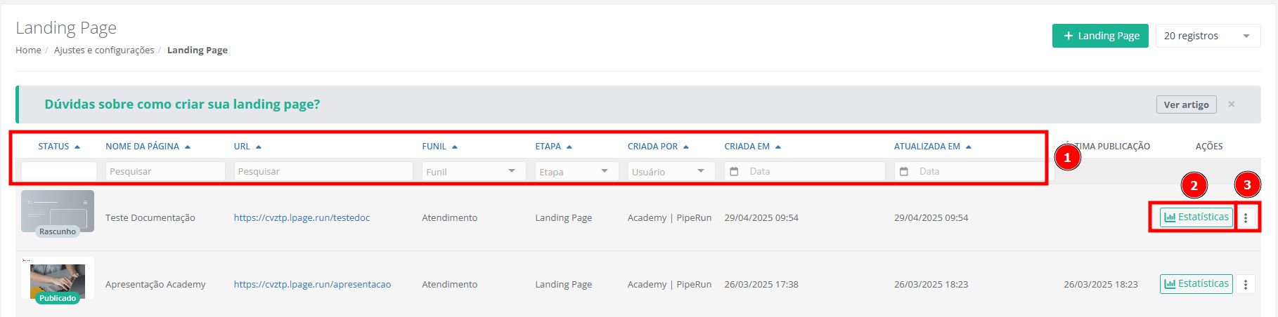 Ainda, na listagem de landing pages é possível filtrar (1) por status, nome da página, URL, funil, etapa, usuário responsável pela criação, data de criação e data de atualização. Também é possível analisar as estatísticas (2) e no ícone dos três pontos (3), publicar ou desativar (2), editar (3), duplicar (4) ou remover (5) uma landing page.
