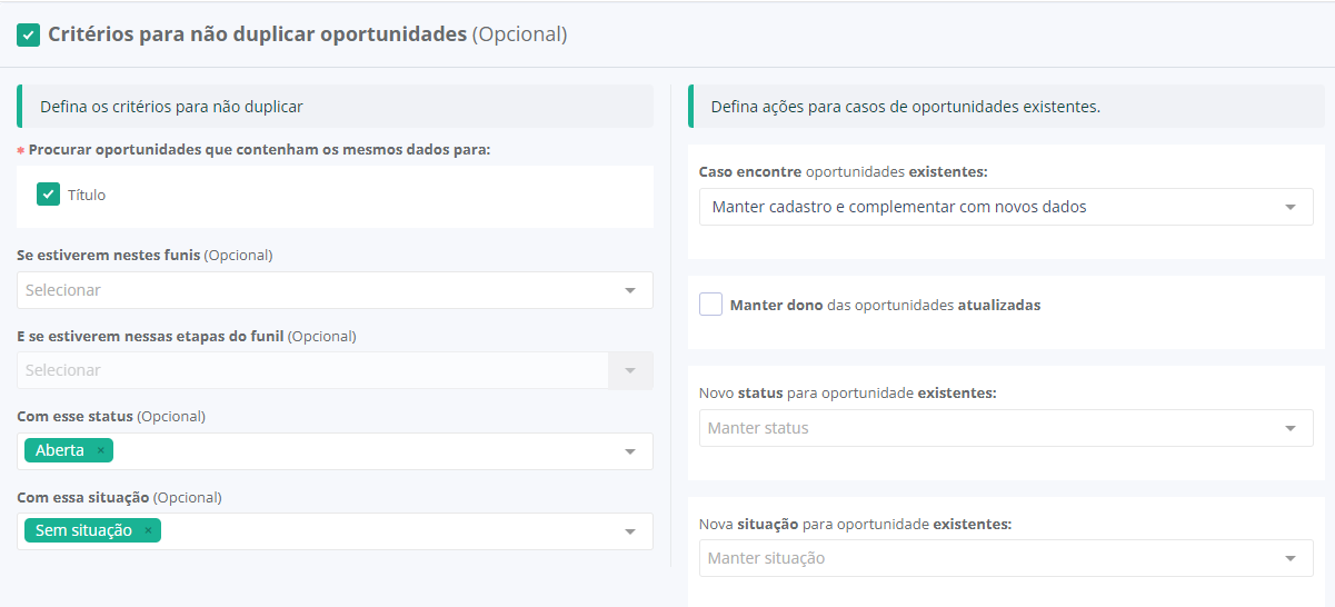 Marque esta opção se deseja que as oportunidades não sejam duplicadas, assim você poderá informar critérios de validação para que o sistema busque por oportunidades já existentes.