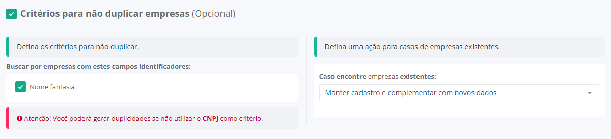 Marque esta opção se deseja que os cadastros de empresas não sejam duplicados, assim você poderá informar critérios de validação para que o sistema busque por empresas já existentes.