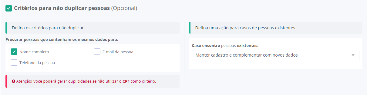 Marque esta opção se deseja que os cadastros de pessoas não sejam duplicados, assim você poderá informar critérios de validação para que o sistema busque por pessoas já existentes.