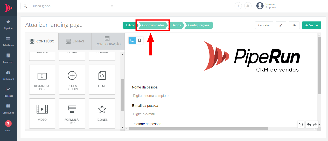 No CRM de Vendas PipeRun é possível criar landing pages. Essa funcionalidade permite que oportunidades sejam criadas a partir de páginas de conversão.