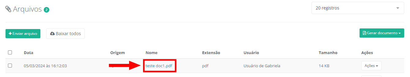 4. Caso deseje visualizar o documento criado, clique em cima do nome do documento. Ao clicar, você será direcionado para uma nova aba, onde você poderá verificar as informações do arquivo.