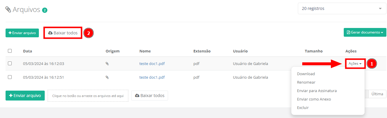 Caso nesta tela você tenha mais de um arquivo e deseje fazer o download de todos, de uma única vez, pode clicar em "Baixar todos" (2).