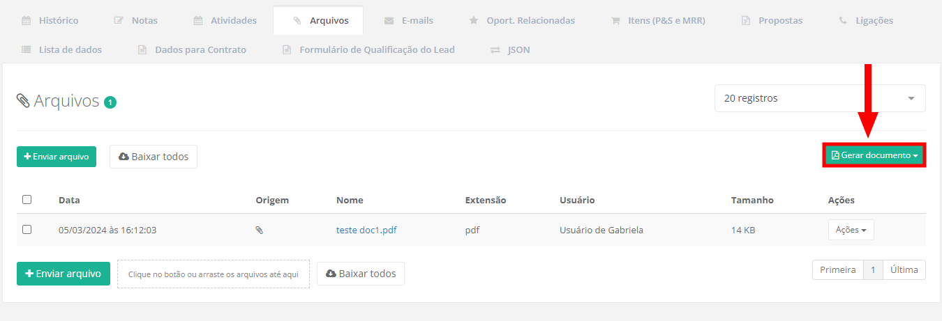 1. Após ter criado o modelo de documento, você pode gerá-lo na oportunidade que desejar. Para isso, acesse uma de suas oportunidades e, em seguida, clique na aba "Arquivos".